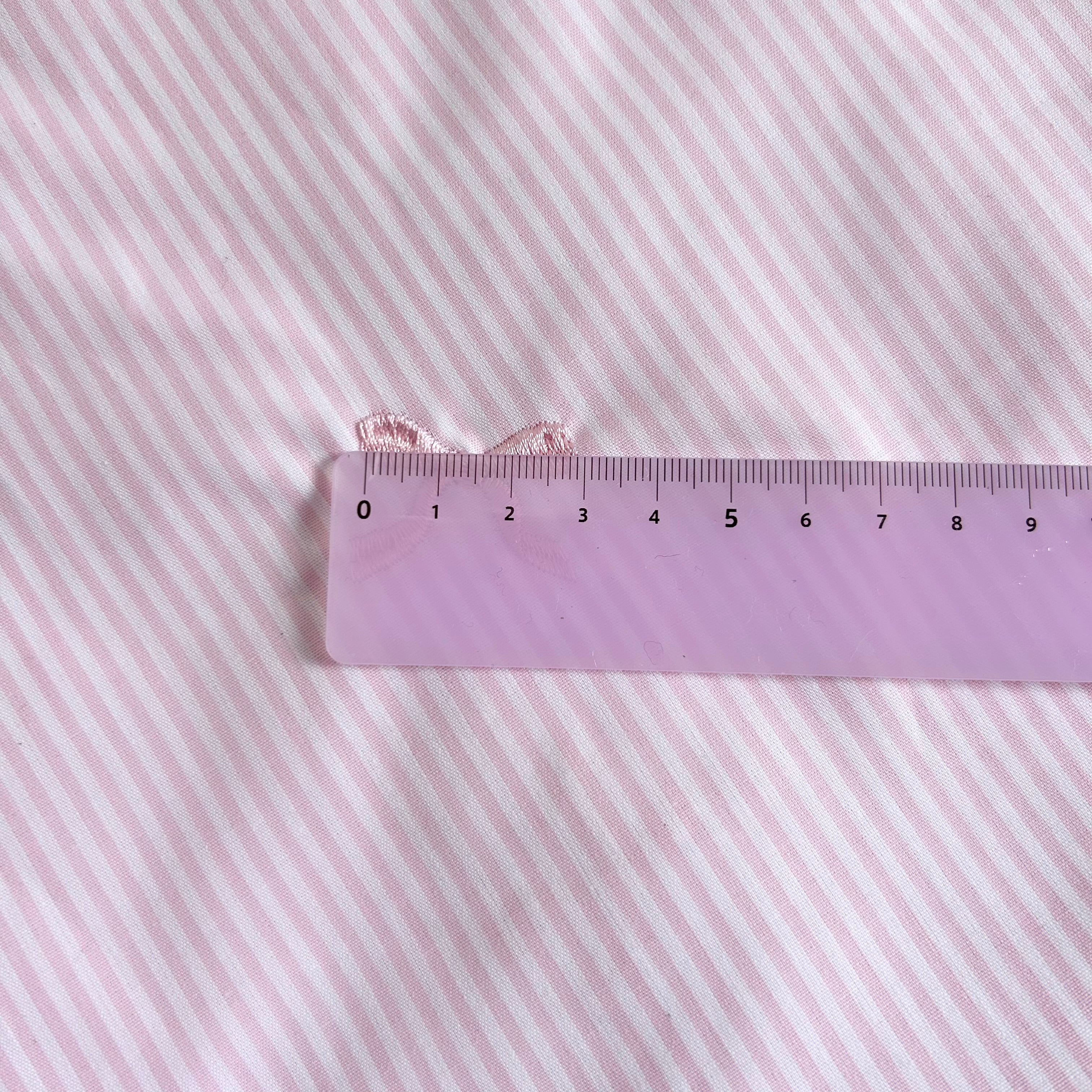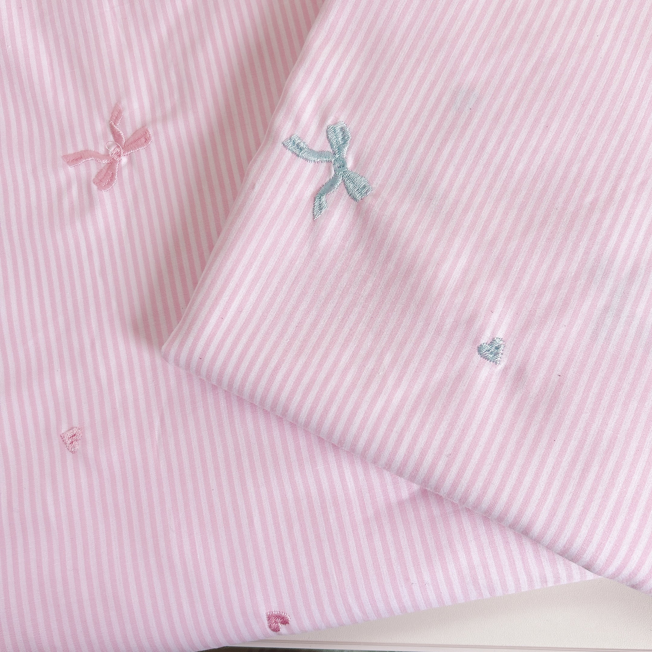 ストライプの生地に、リボンとハートの刺繍が入った生地です♡
